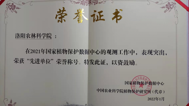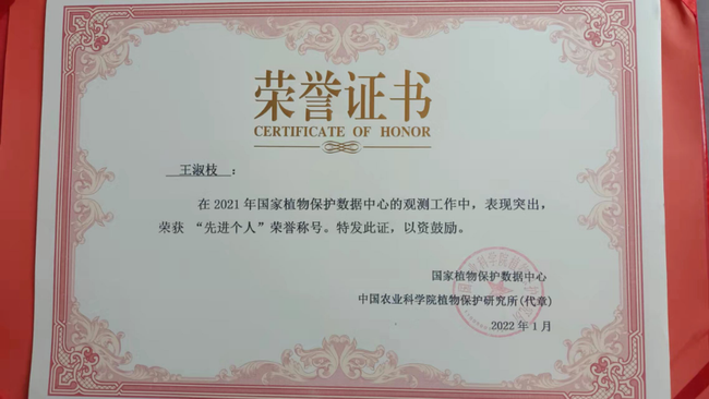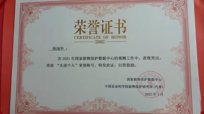近日,我院收到了国家植物保护数据中心颁发的荣誉证书,荣获“先进单位”荣誉称号,植物保护所韩瑞华、王利霞、王淑枝3名同志获“先进个人”荣誉称号。这是国家植物保护数据中心对我院观测工作的肯定。
