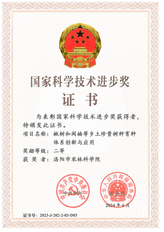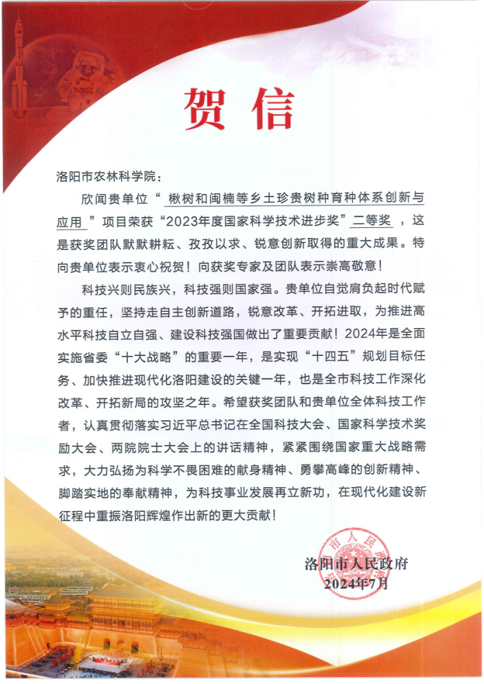 荣获国家科学技术进步奖二等奖和市政府贺信表彰,是我院科技创新建设的重大荣誉,是我院推进“12366”工作思路,奋力冲击高层级科技成果的又一突破,更是我院科技人员面向国家重大需求、面向科技强国战略目标,勇担时代使命、勇攀科技高峰的生动实践。下一步,我院将组织全院科技人员深入学习贯彻习近平总书记关于科技创新的重要讲话精神和市政府贺信精神,持续弘扬科学家精神,紧紧围绕我市5大特色优势产业链强化科技创新,用更多的“洛字号”新品种、新技术、新模式,为贯彻市委乡村振兴“151”工作举措、“4+2”阶段性重点工作和现代化洛阳产业发展贡献更大科技力量!(供稿:林业研究所 曹文昱)