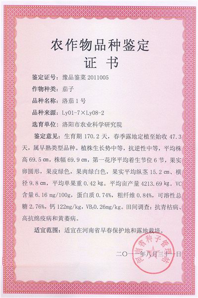2010年经河南省农业科学研究院植物保护研究所抗病性鉴定,结果表明,洛茄1号,抗青枯病、高抗绵疫病和黄萎病,病情指数分别为0.88、3.22和3.64。