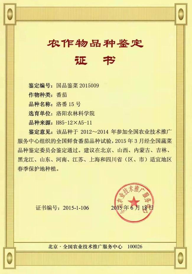 洛番15号是e77乐彩选育的早熟、粉红果、优质、抗病、高产耐贮运番茄一代杂交种。2015年通过国家审定。