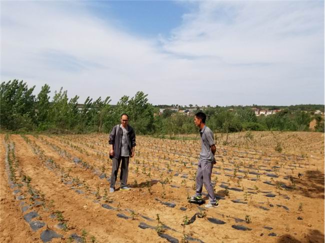 在宜阳县韩城镇朱家沟村,王跃卿副研究员同该村村主任朱海强就科技振兴乡村工作进行接洽。朱家沟全村600多口人,1500多亩耕地,其中1000亩土地流转种植花椒。现村里主要有蔬菜大棚50多个,占地80多亩,主要种植西红柿;今年发展种植花椒200亩、金丝菊200亩,丹参70亩;养羊300多只。
