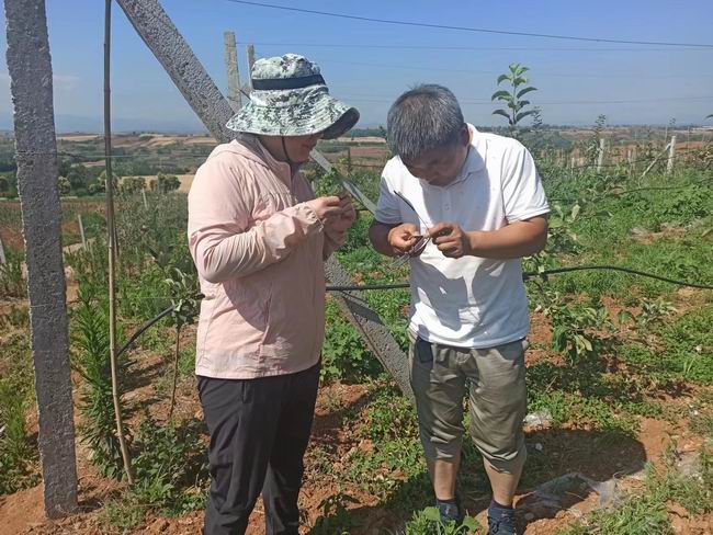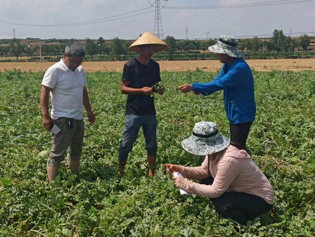 6月21日下午服务团一行来到木植街乡张槐村为该村种植的西瓜进行技术指导,该村西瓜是在羊肚菌采摘结束后种植的,采用保护地种植,技术人员根据该村西瓜品种特点与今年气候条件建议:1、今年气候干旱,大棚种植浇水要适当,以防后期瓜果开裂;2、气候干旱、高温,在病虫害防治上要注意防治刺吸式虫害如红蜘蛛、蚜虫等,用药时注意温度,要坚持用微毒或低毒农药,生产安全果品;3、明年种植要选用嫁接苗,种植时加强管理,增施有机肥,坚持两蔓一瓜,品质优先。服务团一行又来到嵩县旧县镇上川村的西瓜进行指导,该村西瓜部分缺少浇灌条件,果实偏果较多,容易后期开裂,专家建议其把前期坐果不正的去除,利用二茬瓜,延迟上市,增加收入,同时针对该村西瓜棉铃虫及甜菜夜蛾啃食瓜面,造成商品性降低,建议其用微毒农药氯虫本甲酰胺进行防治。然后服务团对洛阳爱情果有限公司种植的猕猴桃进行技术指导,建议其根据长势进行追肥,同时及时牵引上架,在架面铁丝下30公分打顶,促进叶芽萌发培养主蔓,并为其送去病虫防治的物资。